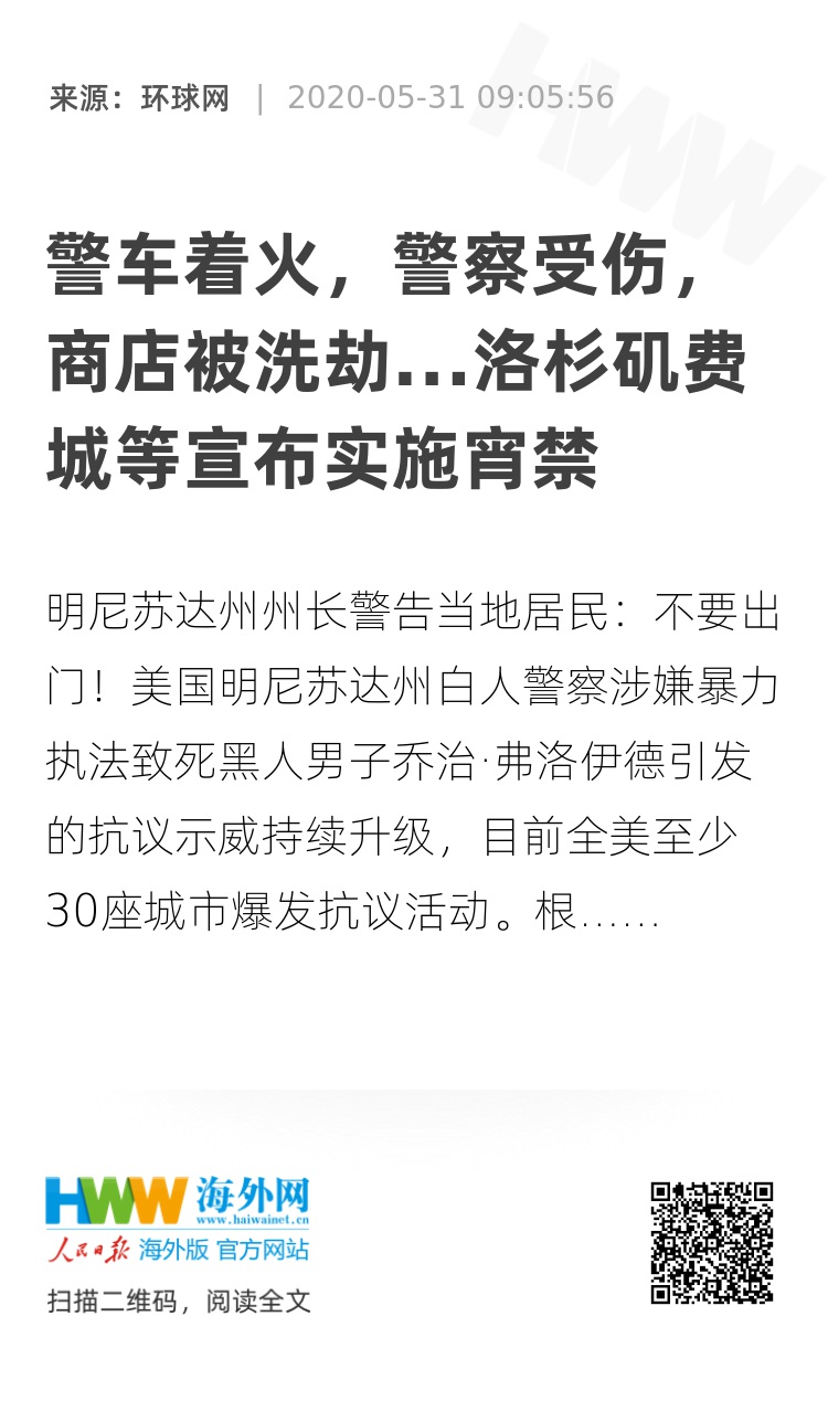 法新社刚刚消息,美国多地发生抗议示威后,洛杉矶、费城和亚特兰大等多地宣布实行宵禁。