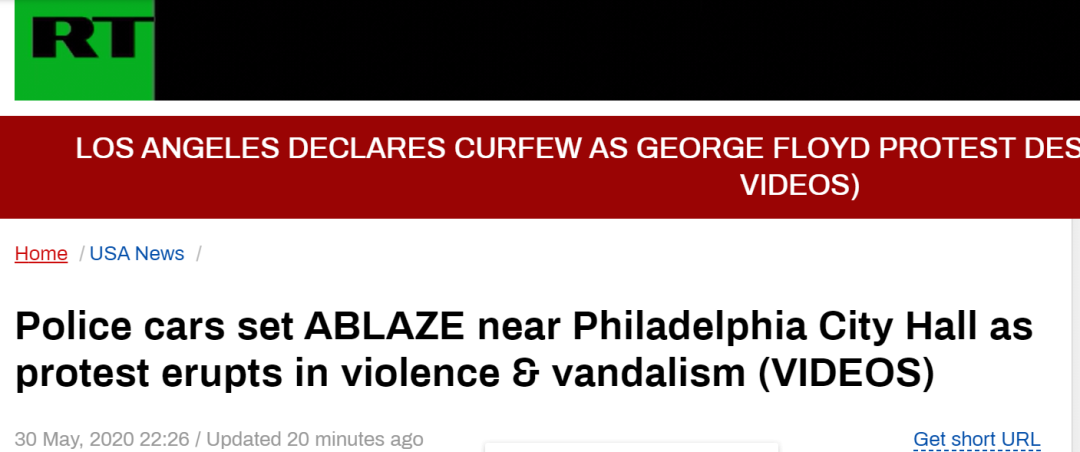 据“今日俄罗斯”(RT)刚刚消息,当地时间周六下午,由乔治·弗洛伊德之死引发的街头示威活动在费城爆发。