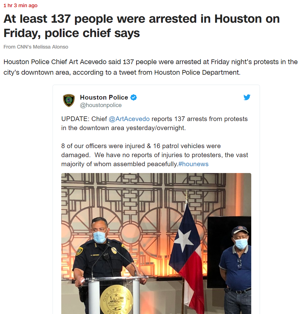美国明尼苏达州白人警察涉嫌暴力执法致死黑人男子乔治·弗洛伊德引发的抗议示威持续升级,目前全美至少30座城市爆发抗议活动。据美国有线电视新闻网(CNN)最新消息,休斯顿警察局长艾卡·维多于30日表示,当天晚上在该市市中心的抗议活动中有137人被捕。