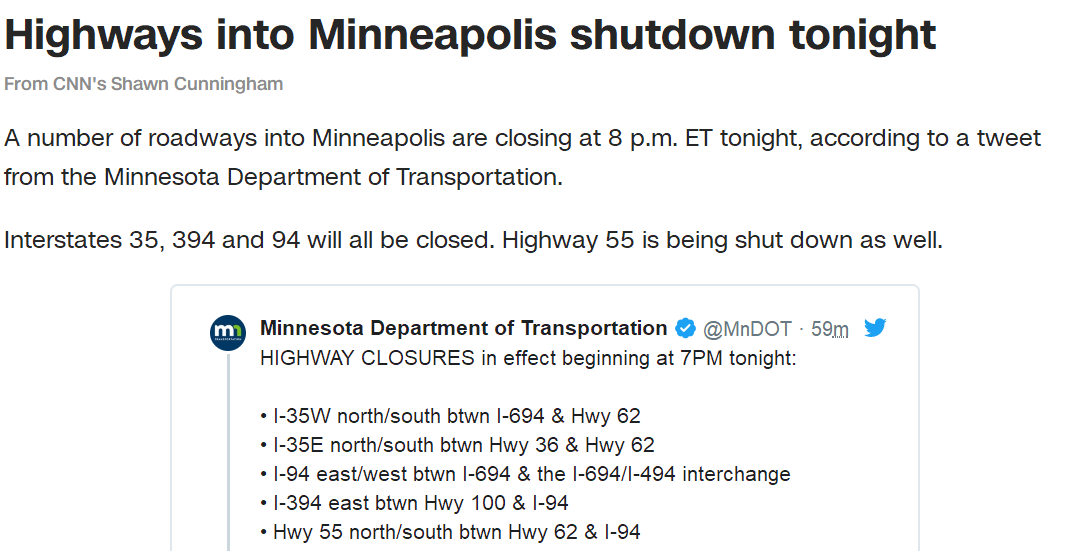 CNN援引明尼苏达州交通部推特消息称,美东时间30日晚8点,通往明尼阿波利斯的公路将关闭——35号、394号和94号州际公路将全部关闭。55号高速公路也将被关闭。