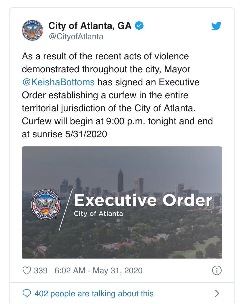 她补充说:“所以,宵禁的意思是,请你在9点之前回到家,这样我们才可以使我们的城市恢复原貌。感谢今天在街上清理我们城市的市民们。上帝保佑你们所有人。这就是亚特兰大。”