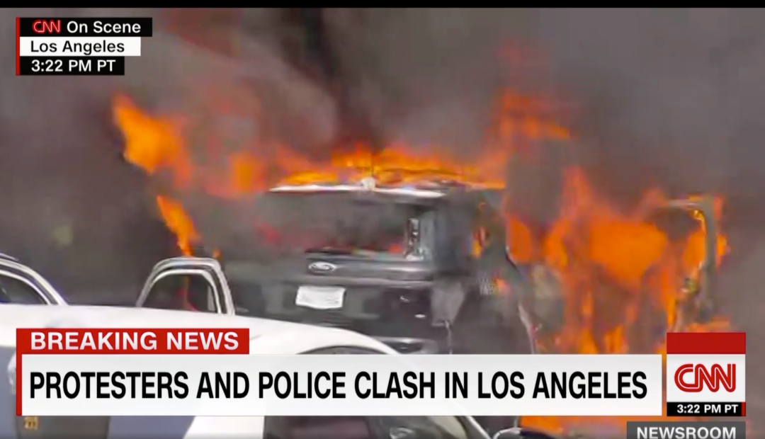 据报道,洛杉矶一辆警车着火,警察们在阻止示威者靠近汽车。