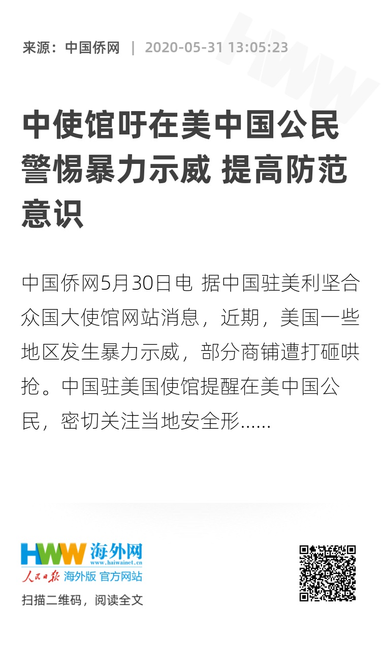 中国侨网5月30日电 据中国驻美利坚合众国大使馆网站消息,近期,美国一些地区发生暴力示威,部分商铺遭打砸哄抢。中国驻美国使馆提醒在美中国公民,密切关注当地安全形势发展,注意警方发布的有关游行、示威及可能发生骚乱的通知通告,避免前往相关危险区域。经营店铺的中国公民请切实提高风险防范意识,根据自身情况加强住所及经营场所安保措施。遇紧急情况请及时报警,同时可与中国驻美使领馆联系。