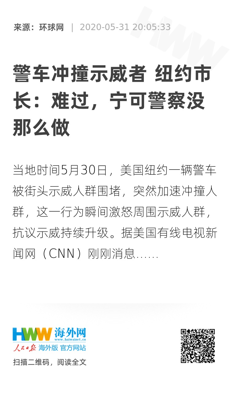 当地时间5月30日,美国纽约一辆警车被街头示威人群围堵,突然加速冲撞人群,这一行为瞬间激怒周围示威人群,抗议示威持续升级。据美国有线电视新闻网(CNN)刚刚消息,美国纽约市市长白思豪(Bill De Blasio)于当地时间30日深夜就此事表态称事件令人难过,他宁可警察没有那么做。但他同时谴责示威者“做了错误的事”,并表示不会责罚警察。