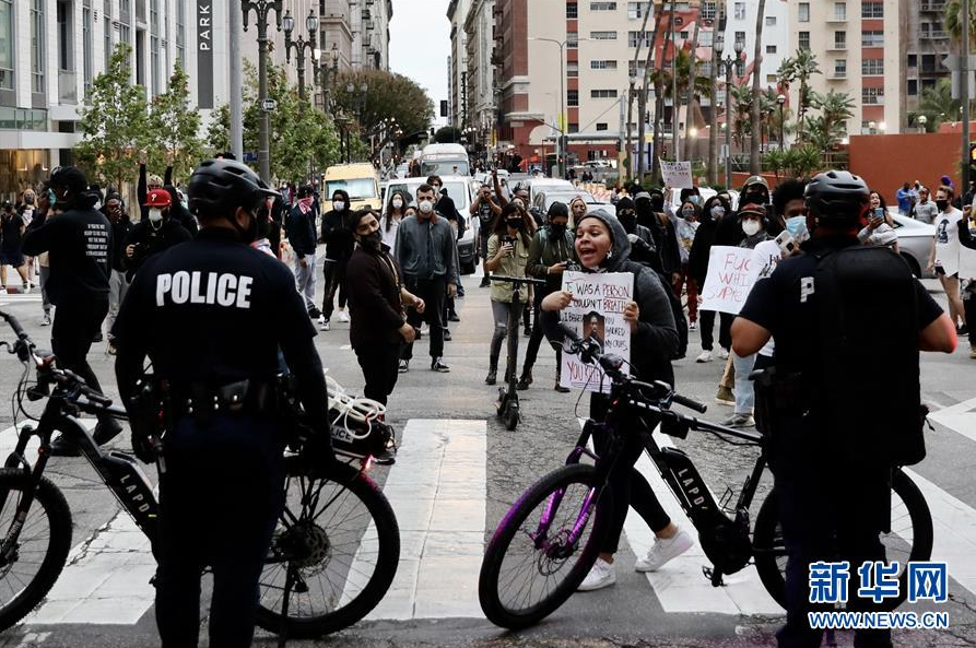 5月29日,抗议者在美国洛杉矶街头游行示威。 美国西部第一大城市洛杉矶29日连续第三天发生抗议警方暴力执法的示威游行并发展为骚乱。当地警方表示,至30日晨已有533人被逮捕。 新华社发