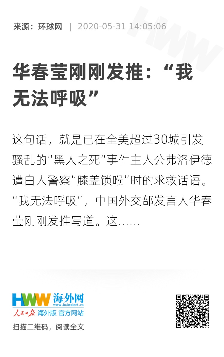 “我无法呼吸”,中国外交部发言人华春莹刚刚发推写道。这句话,就是已在全美超过30城引发骚乱的“黑人之死”事件主人公弗洛伊德遭白人警察“膝盖锁喉”时的求救话语。