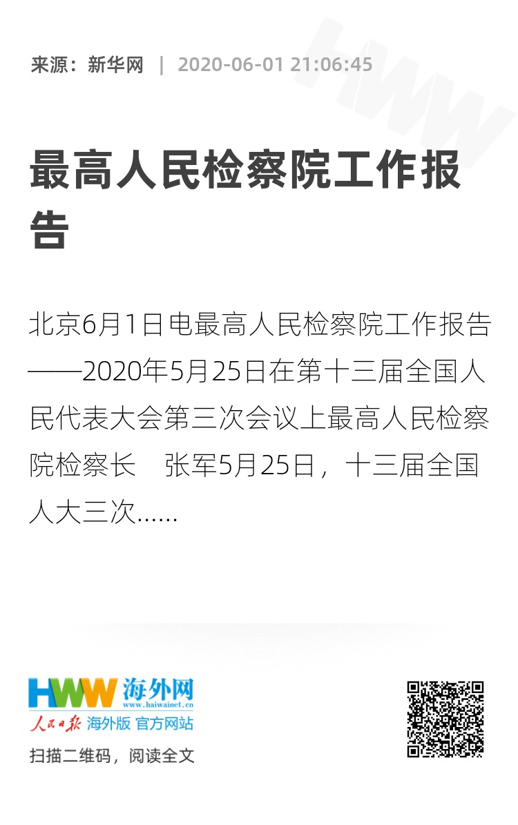 各位代表,70年来,伴随着共和国波澜壮阔的历史征程,人民检察院始终践行“为大局服务、为人民司法”的初心和使命。置身中华民族伟大复兴战略全局和世界百年未有之大变局,我们将更加紧密团结在以习近平同志为核心的党中央周围,以习近平新时代中国特色社会主义思想为指导,认真落实本次全国人大会议要求,自觉接受人民监督,砥砺初心、忠诚履职,为全面建成小康社会、实现第一个百年奋斗目标作出新贡献!