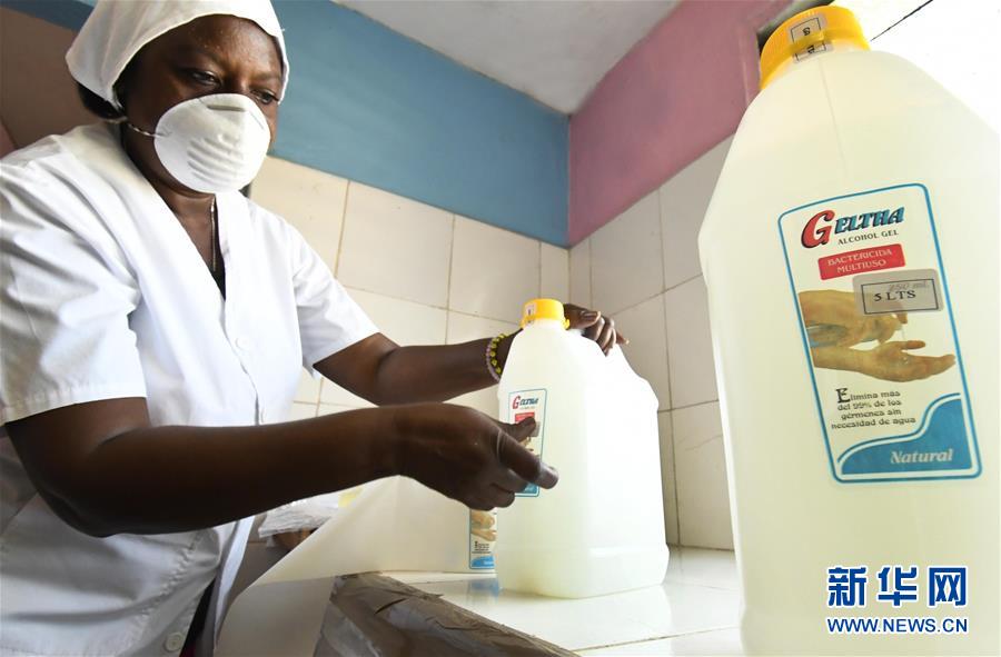 3月26日,在古巴哈瓦那酿酒厂,一名工人给装有抗菌洗手凝胶的瓶子贴标签。 新华社发(华金·埃尔南德斯摄)