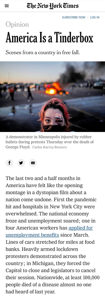 《纽约时报》29日发表文章称,现在有太多事情让美国变得易燃:大规模失业、暴露了健康和经济不平等的疫情、无所事事的青少年、警察暴力、渴望第二次内战的右翼分子以及急于火上浇油的美国总统特朗普。美国现在感觉就像是一个火药桶,正在以自由落体般的速度衰落!