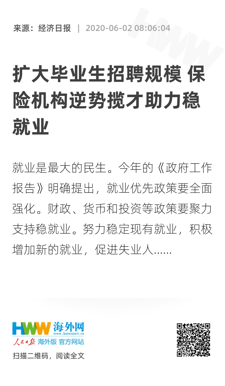“今年高校毕业生规模达到874万人,增量、增幅均为近年之最。疫情突发正值春季招聘期,毕业生求职就业受到了较大影响。”中国平安副总经理兼首席人力资源执行官蔡方方说,《政府工作报告》提出,千方百计稳定和扩大就业。保险机构也是这么做的,因为就业关乎国计民生,更关乎千家万户。
