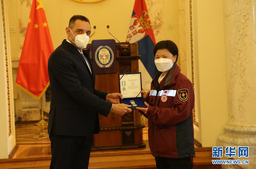 6月1日,塞尔维亚国防部长武林(左)在塞尔维亚首都贝尔格莱德向中国赴塞抗疫医疗专家组成员成守珍授予军队最高级别纪念勋章。 新华社记者 石中玉 摄