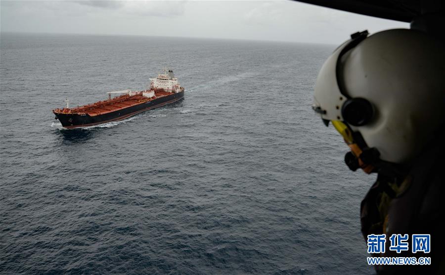 5月31日,在大西洋公海海域,一名委内瑞拉军人在直升机上俯瞰伊朗油轮“克拉维尔”号。 悬挂伊朗国旗的 “克拉维尔”号油轮6月1日驶入委内瑞拉领海。至此,伊朗派出的五艘油轮全部顺利抵委。 新华社发(萨尔加多摄)