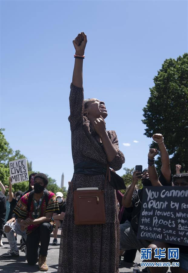 6月1日,一名女子在美国华盛顿白宫前唱歌抗议。新华社记者 刘杰 摄