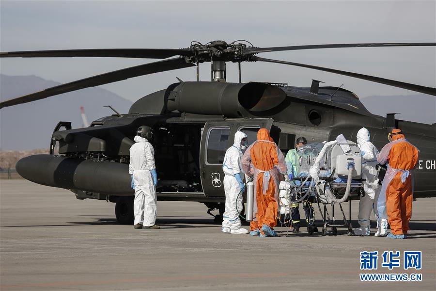 5月23日,在智利圣地亚哥,工作人员将首都大区的新冠重症患者送上空军直升机。他们将被运往周边城市,以分散首都大区医院压力。 智利卫生部6月1日公布的数据显示,截至当地时间5月31日21时,该国新冠确诊病例比前一日增加5471例,累计确诊105159例。人口约1900万的智利成为拉美地区继巴西、秘鲁之后第三个确诊病例超过10万例的国家,日趋严峻的疫情形势使智利医疗系统处于重压之下。 新华社发