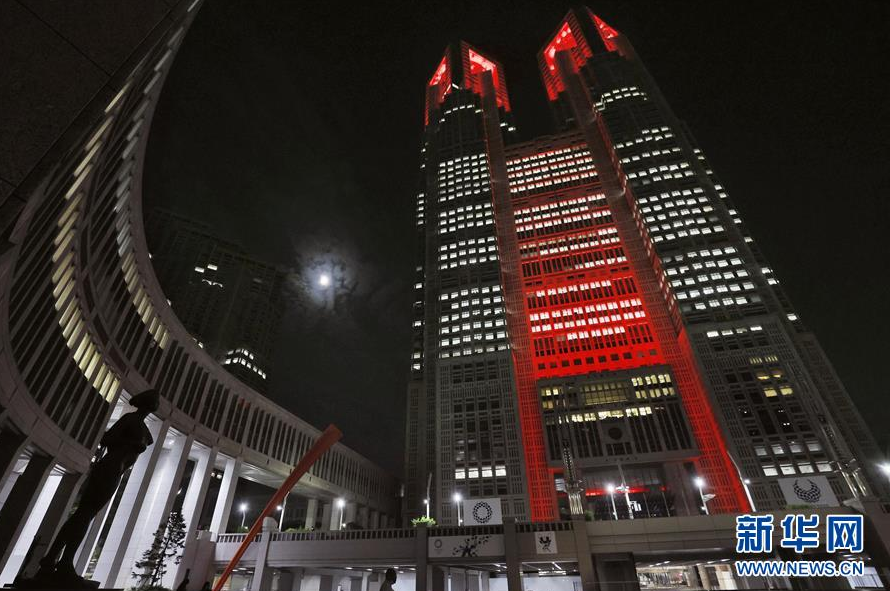 6月2日,日本东京都厅大楼点亮红色灯光,配合发出“东京警报”。新华社/共同社