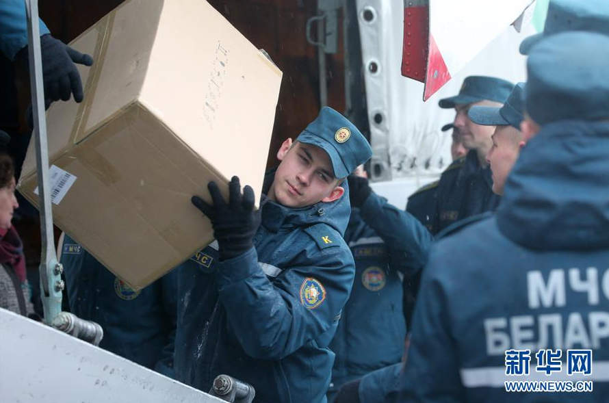 6月2日上午,在白俄罗斯明斯克国际机场,白俄罗斯紧急情况部官兵从一架伊尔-76军用运输机上卸载货物。 新华社发(任科夫摄)