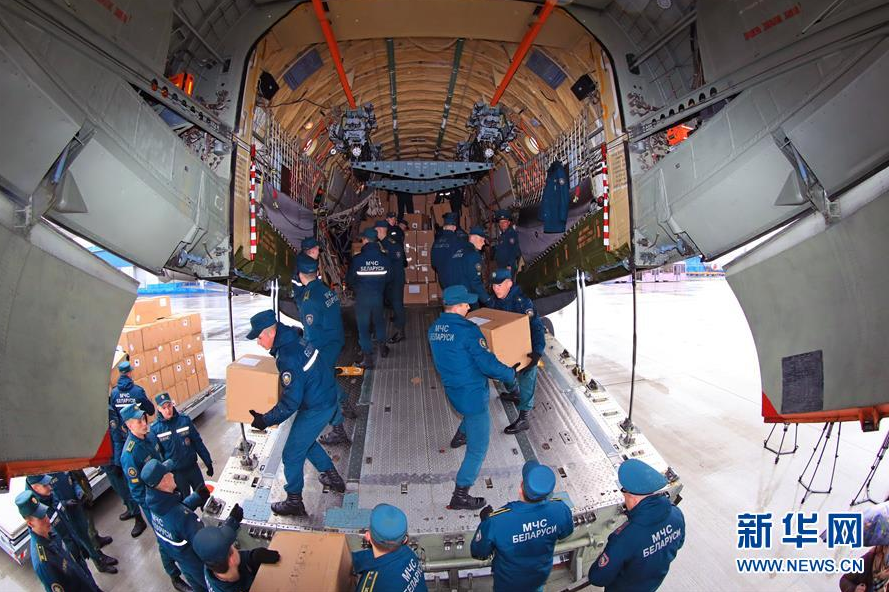 6月2日上午,在白俄罗斯明斯克国际机场,白俄罗斯紧急情况部官兵从一架伊尔-76军用运输机上卸载货物。 新华社发(任科夫摄)