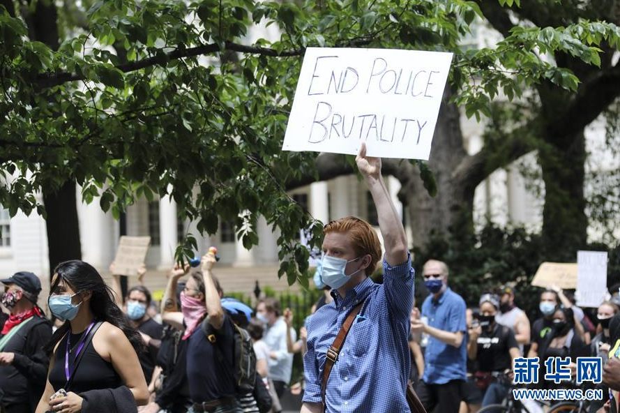 6月2日,民众在美国纽约街头抗议警察暴力执法。 当天,由美国明尼苏达州明尼阿波利斯市警察执法失当致非裔男子乔治·弗洛伊德死亡一事引发的抗议活动在纽约进入第六天,数千民众继续在街头抗议。同时,纽约市宣布将宵禁延长至周日,于每晚8时至次日凌晨5时实施。 新华社记者 王迎 摄