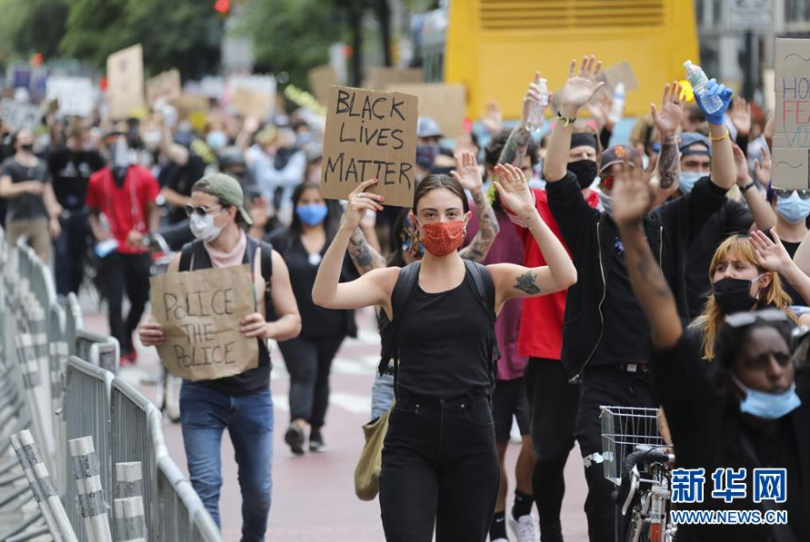 6月2日,民众在美国纽约街头抗议警察暴力执法。 当天,由美国明尼苏达州明尼阿波利斯市警察执法失当致非裔男子乔治·弗洛伊德死亡一事引发的抗议活动在纽约进入第六天,数千民众继续在街头抗议。同时,纽约市宣布将宵禁延长至周日,于每晚8时至次日凌晨5时实施。 新华社记者 王迎 摄