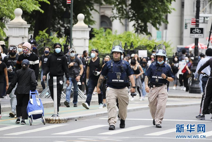 6月2日,警察在美国纽约街头警戒。 当天,由美国明尼苏达州明尼阿波利斯市警察执法失当致非裔男子乔治·弗洛伊德死亡一事引发的抗议活动在纽约进入第六天,数千民众继续在街头抗议。同时,纽约市宣布将宵禁延长至周日,于每晚8时至次日凌晨5时实施。 新华社记者 王迎 摄