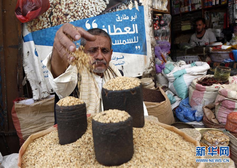 6月2日,商贩在也门首都萨那的市场上出售粮食。联合国和沙特阿拉伯当天共同为也门举办视频国际认捐大会。联合国秘书长古特雷斯呼吁国际社会踊跃捐款,帮助也门渡过人道危机和新冠疫情的双重难关。新华社发(穆罕默德摄)