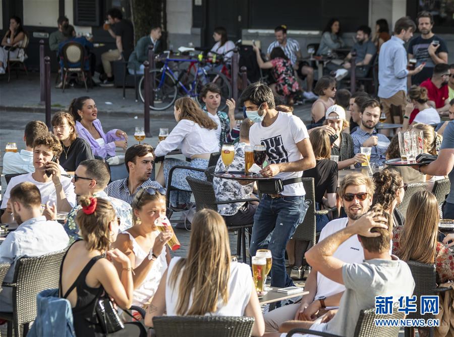 6月2日傍晚,人们在法国北部城市里尔一家酒吧的露天区域休闲。 法国自2日起进入解禁第二阶段。全国餐馆、咖啡馆、酒吧等恢复营业,多数初中和高中复课,居民出行离家距离不得超过100公里的限制也被取消。 新华社发(塞巴斯蒂安·库尔吉摄)