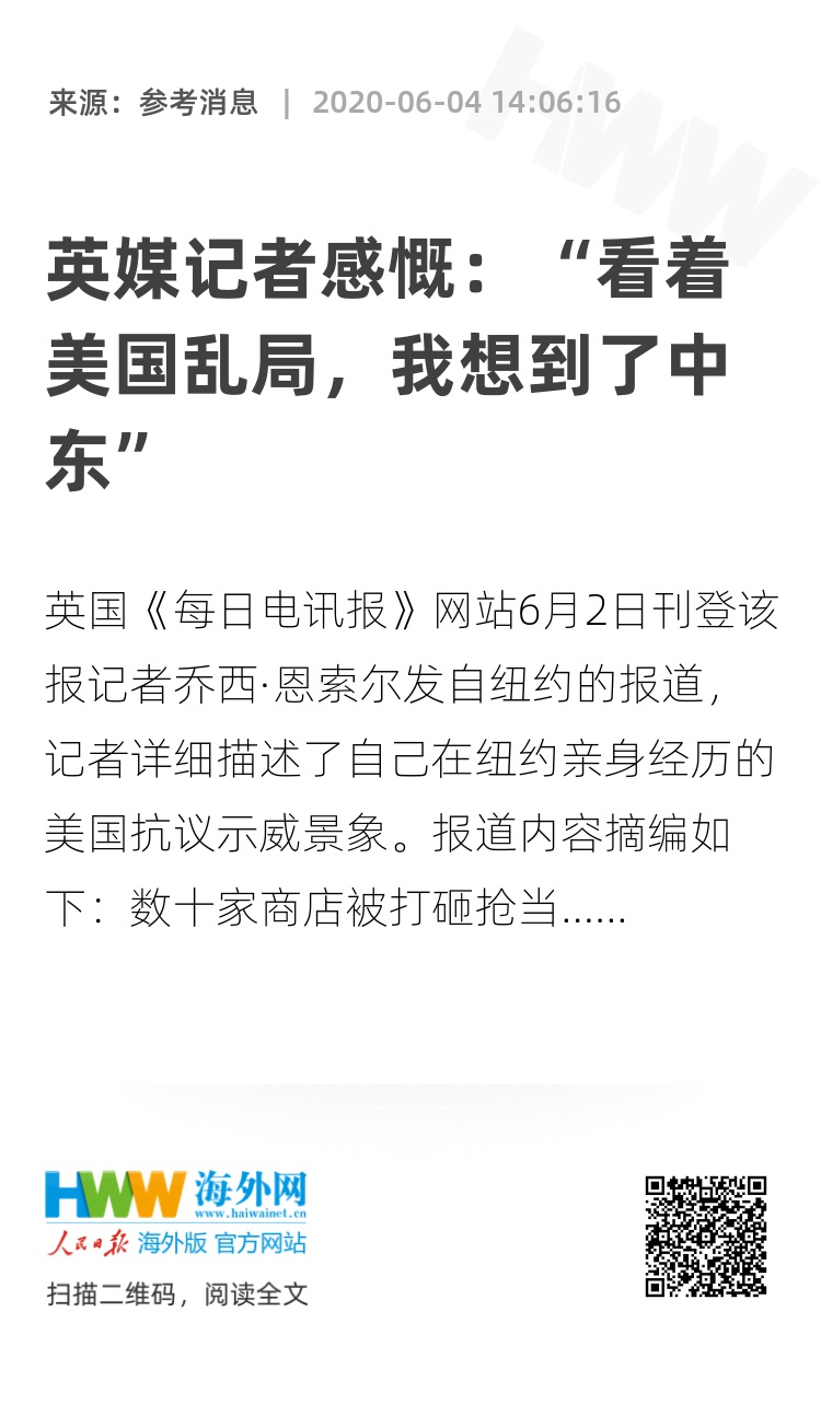 英国《每日电讯报》网站6月2日刊登该报记者乔西·恩索尔发自纽约的报道,记者详细描述了自己在纽约亲身经历的美国抗议示威景象。报道内容摘编如下: