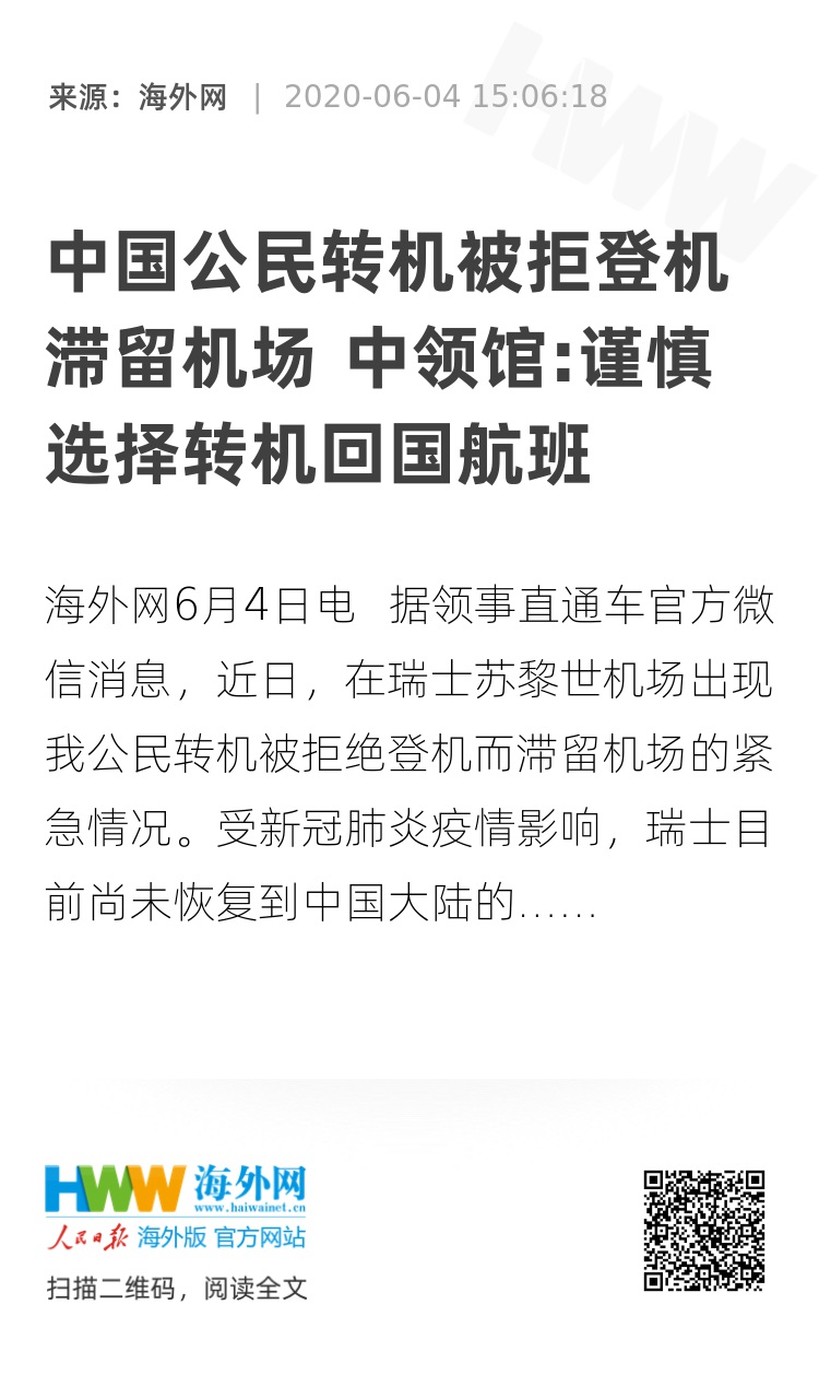 海外网6月4日电 据领事直通车官方微信消息,近日,在瑞士苏黎世机场出现我公民转机被拒绝登机而滞留机场的紧急情况。受新冠肺炎疫情影响,瑞士目前尚未恢复到中国大陆的直航航班,苏黎世至新加坡、苏黎世至香港等航线因受中转国或地区的中转、入境政策限制无法登机。在此,郑重提醒大家,近期谨慎选择以上航线,以避免因航程中断且又无法返回原出发地而被迫滞留。