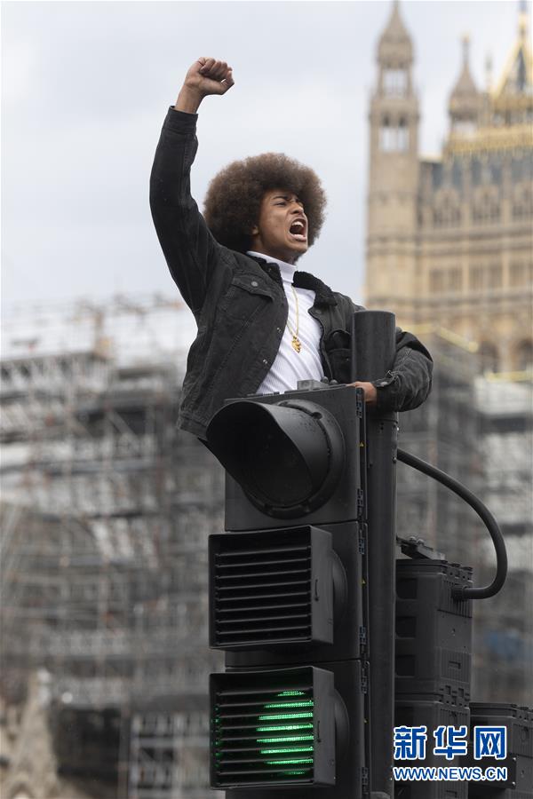 6月3日,英国伦敦民众举行示威活动,抗议美国明尼阿波利斯市警察执法失当致非裔男子乔治·弗洛伊德死亡。新华社发(雷伊·唐摄)