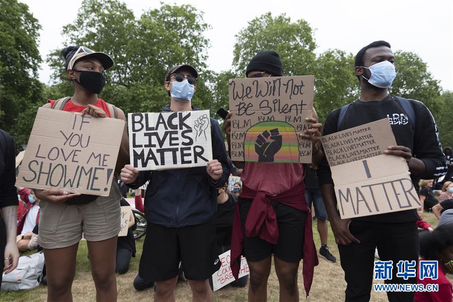 6月3日,英国伦敦民众举行示威活动,抗议美国明尼阿波利斯市警察执法失当致非裔男子乔治·弗洛伊德死亡。新华社发(雷伊·唐摄)