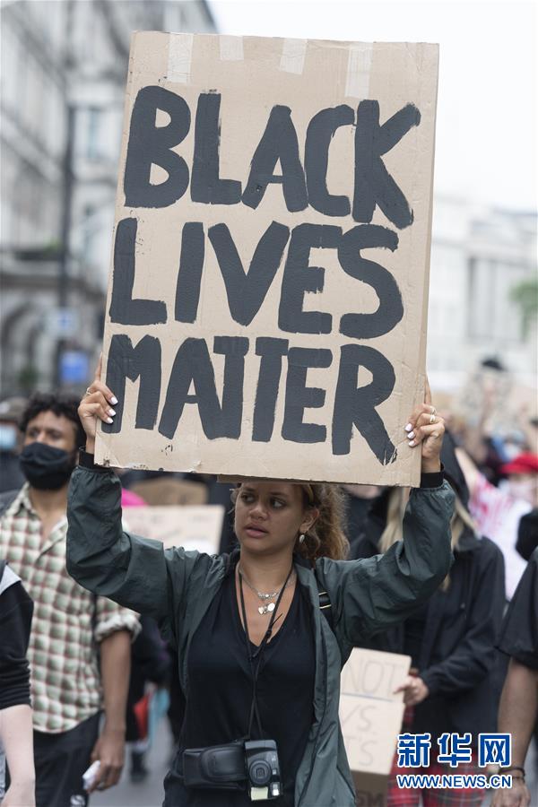 6月3日,英国伦敦民众举行示威活动,抗议美国明尼阿波利斯市警察执法失当致非裔男子乔治·弗洛伊德死亡。新华社发(雷伊·唐摄)