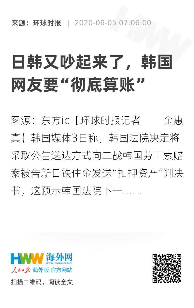 日本时事通讯社4日称,日本外相茂木敏充3日与韩国外长康京和通话时表示,变卖日企资产将导致严重后果。对此,韩国网民回怼称“韩日关系还有恶化的余地吗?趁此机会,我们要彻底跟日本算清这笔账”。
