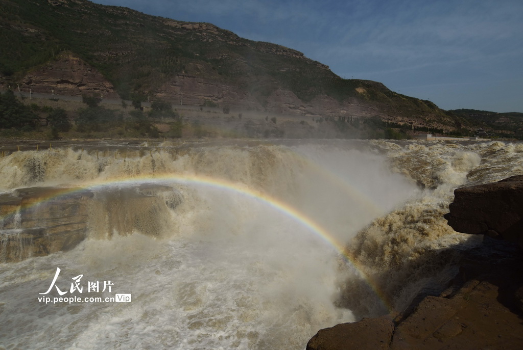 2020年6月4日,在山西省临汾市吉县拍摄的奔腾咆哮的黄河壶口瀑布。当日,受上游水库调节放水影响,黄河晋陕峡谷水量大增 ,每秒流量超过一千立方米,壶口瀑布再现百米壮美瀑布群景观,吸引了众多游客。吕桂明/人民图片