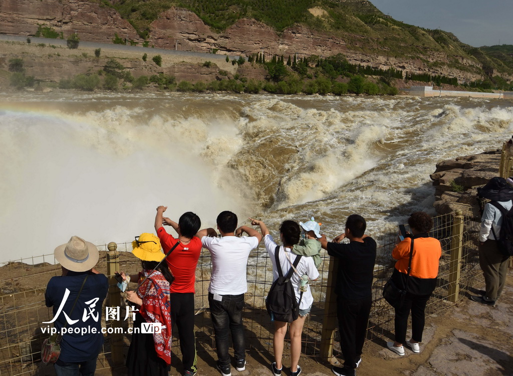 2020年6月4日,在山西省临汾市吉县拍摄的奔腾咆哮的黄河壶口瀑布。当日,受上游水库调节放水影响,黄河晋陕峡谷水量大增 ,每秒流量超过一千立方米,壶口瀑布再现百米壮美瀑布群景观,吸引了众多游客。吕桂明/人民图片