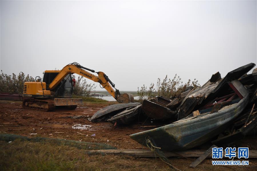 在湖南常德汉寿县蒋家嘴镇,工作人员在洞庭湖边驾驶挖掘机回收渔船(2019年12月17日摄)。新华社记者 薛宇舸 摄