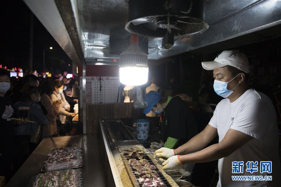 6月4日,商家在哈尔滨市“师大夜市”上制作美食。 近日,哈尔滨市夜市相继恢复营业,不少市民前来消费休闲,冰城夜晚重现盎然生机。 新华社发(张涛 摄)