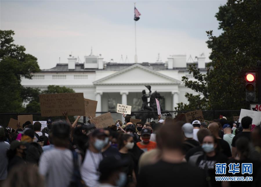 6月4日,人们在美国华盛顿白宫前抗议。 美国各地因弗洛伊德事件引发的抗议示威浪潮4日仍在持续。 新华社记者 刘杰 摄