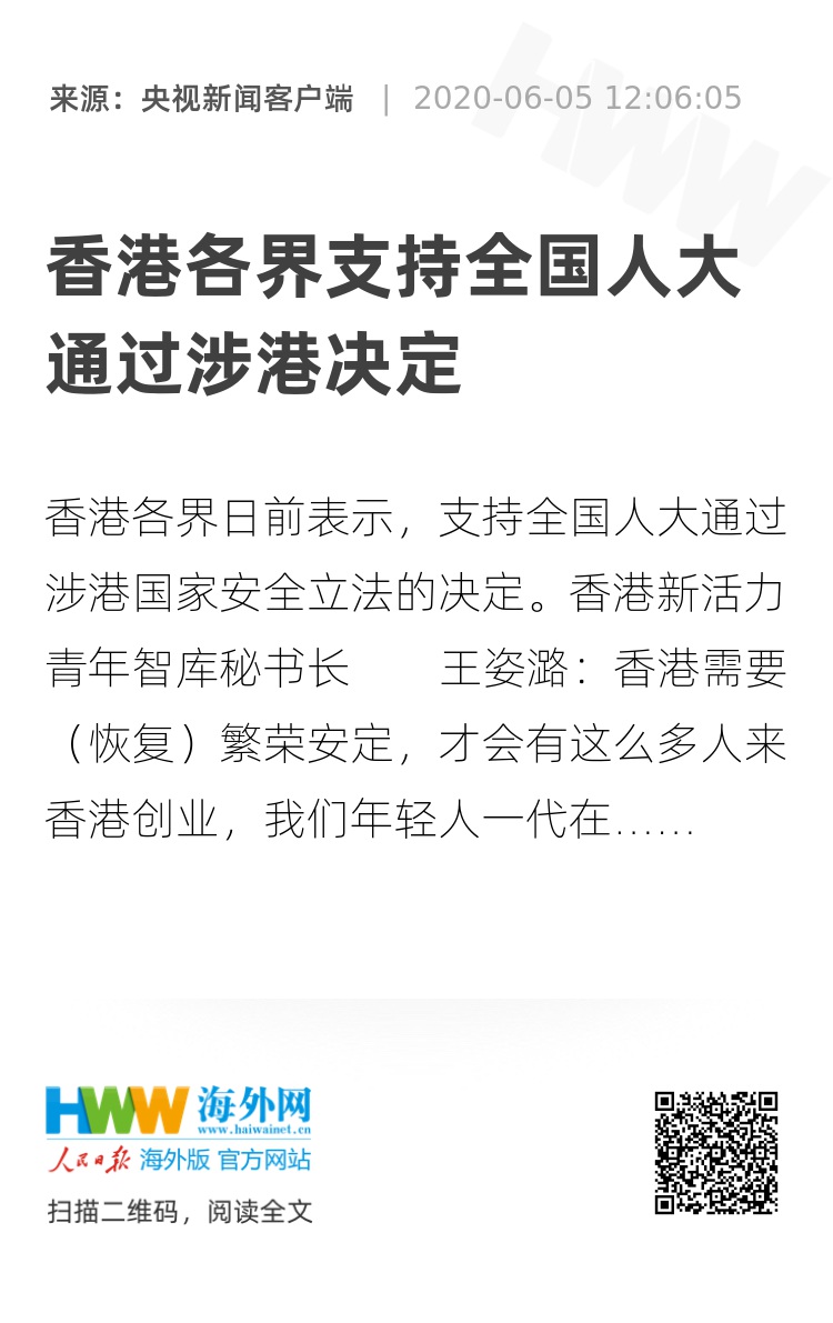 香港青年发展委员会委员 谢晓虹:我自己还有我身边的同学跟朋友他们都是非常支持这个港区国家安全法的,应该说其实大家都期待已久。对我们香港青年来说,是很大的一个信心的给予,对香港青年的未来是给予了一个稳定的环境,也让我们整个社会可以有一个稳定的发展。