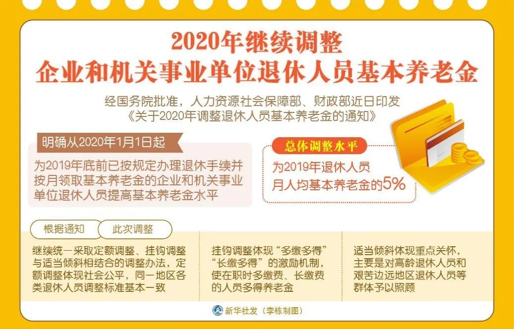 人力资源和社会保障部、财政部日前明确,从2020年1月1日起,为2019年底前已按规定办理退休手续并按月领取基本养老金的企业和机关事业单位退休人员提高基本养老金水平,总体调整水平为2019年退休人员月人均基本养老金的5%。