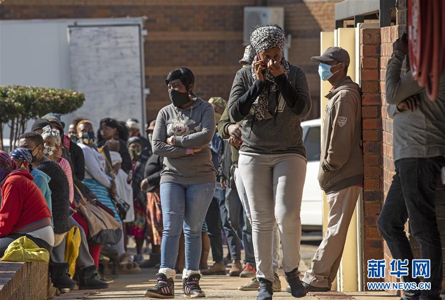 6月5日,在南非约翰内斯堡索韦托,市民排队领取食品。 当日,南非一些慈善组织为约翰内斯堡索韦托的部分贫困居民发放食物和防护用品。截至5日,南非累计报告新冠确诊病例40792例,累计死亡848例。 新华社记者 陈诚 摄