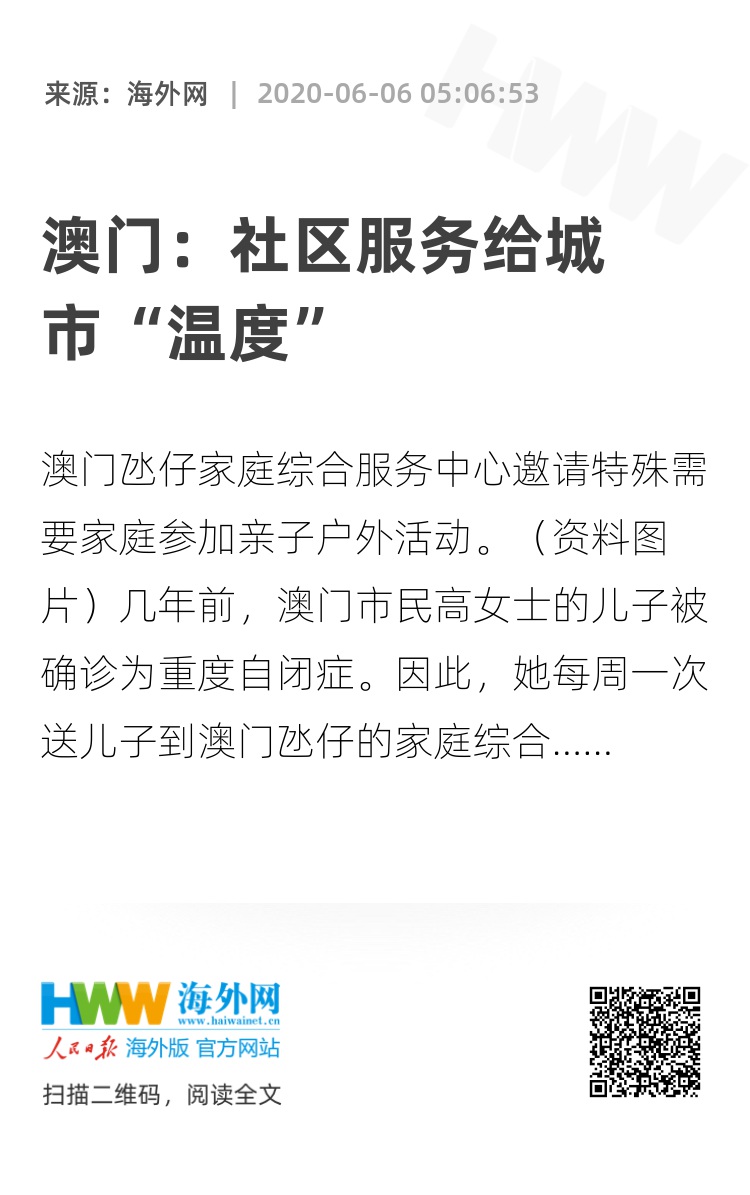 据澳门特区政府社会工作局职务主管黄柏基介绍,澳门共有36个以家庭为对象的社区服务中心,员工共400人,其中专业社工160人。去年一共服务了30万户家庭,跟进了200个家庭个案。