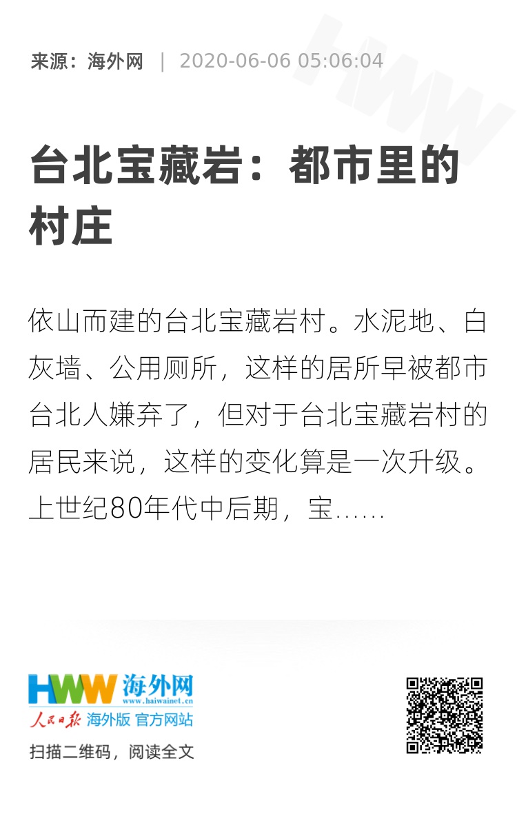 1993年,台北市公告拆除违建区宝村,当时的100多位居民不同意。拉锯到1997年,同情村民的台湾大学建筑系开始进村调查、访谈,挖掘出宝村的人文意义,提出在此设立文化景观,得到时任市长马英九的认可。