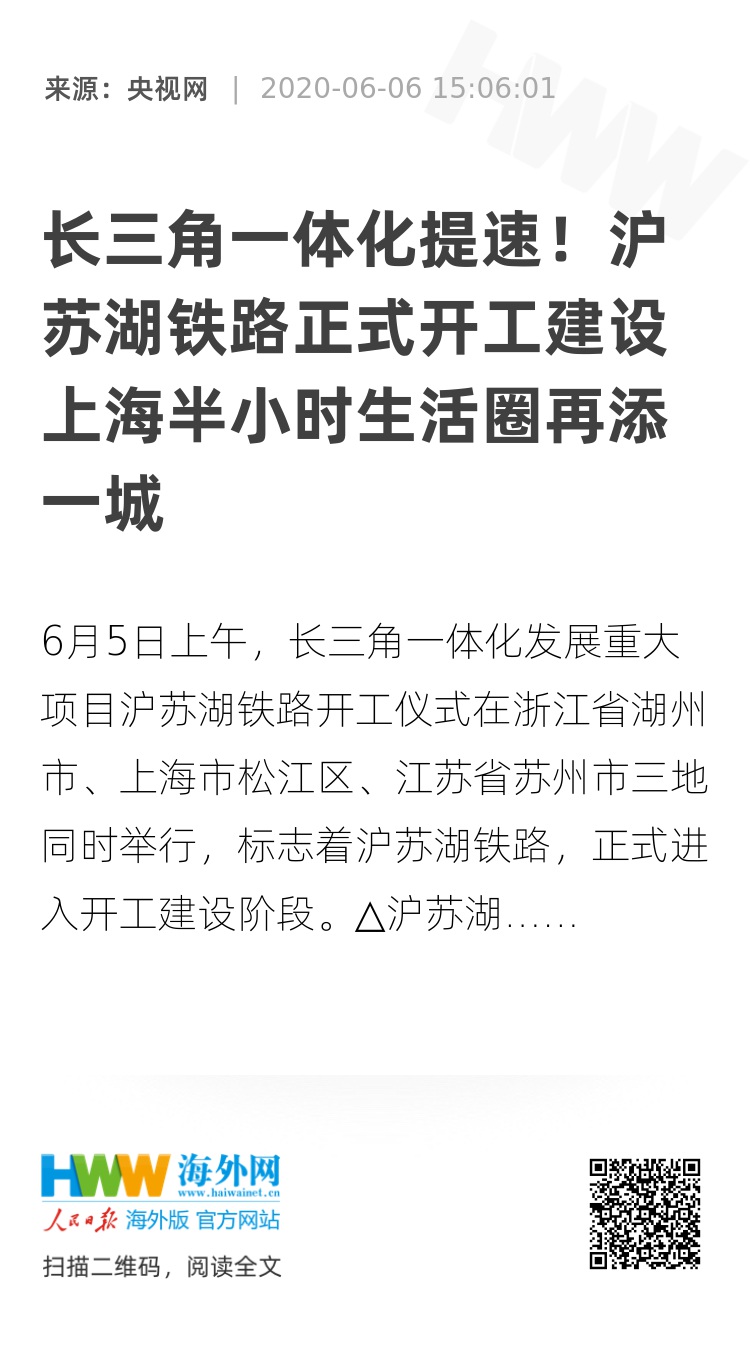 线路建成后将在湖州与宁杭高铁在建的商合杭高铁南段和湖杭高铁衔接,在苏州吴江与年内力争开工建设的通苏嘉甬铁路相连,成为长三角地区城际铁路网的骨干线路,和环太湖轨道交通圈的重要组成部分,对于进一步完善长三角高品质快速轨道交通网,共建轨道上的长三角增强长三角地区经济发展的辐射功能助力长三角更高质量一体化发展等具有重要意义。(总台央视记者 盛瑾瑜 吴睿 梁烨)