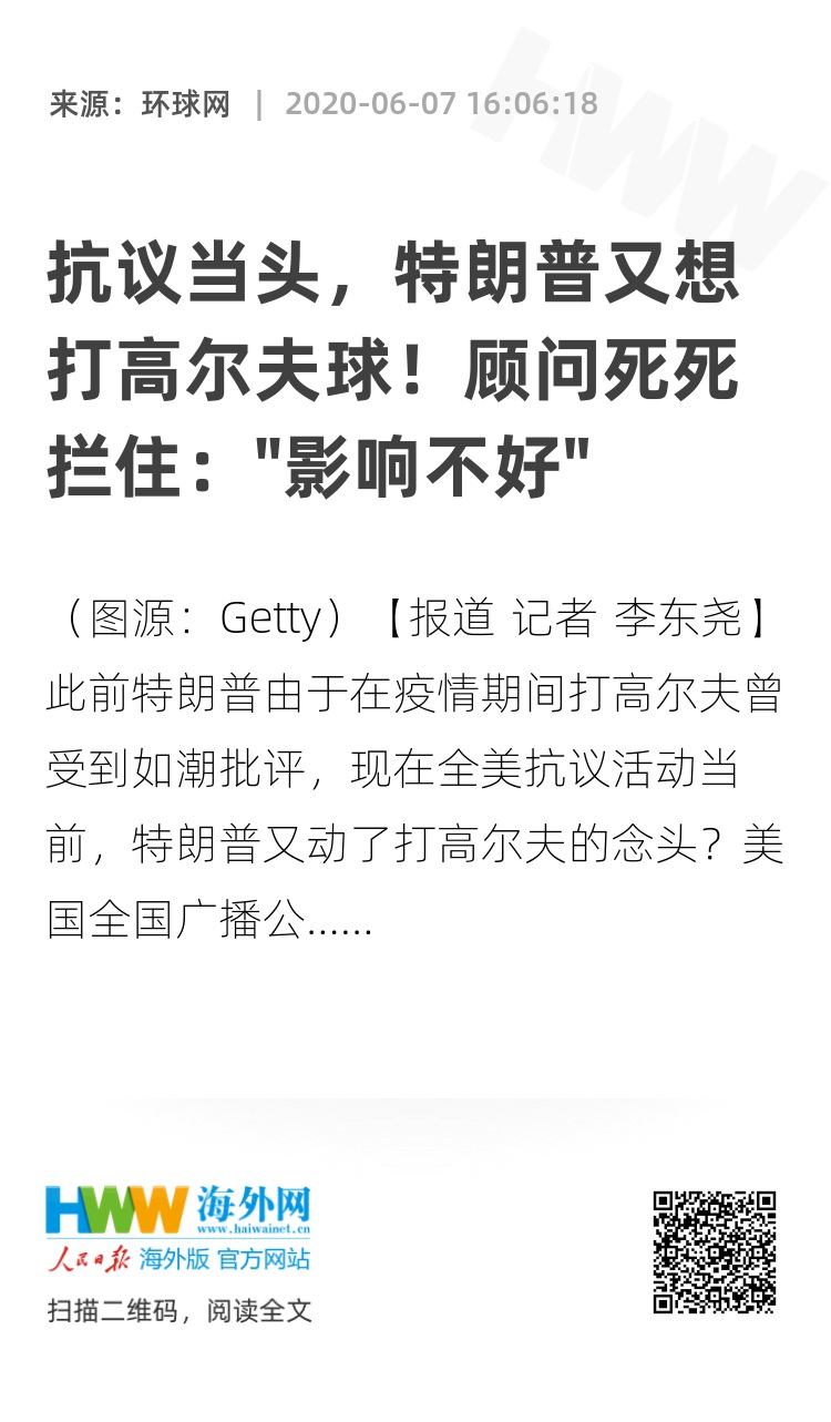 【环球网报道 记者 李东尧】此前特朗普由于在疫情期间打高尔夫曾受到如潮批评,现在全美抗议活动当前,特朗普又动了打高尔夫的念头?美国全国广播公司(NBC)6日报道称,特朗普原计划本周末在他位于新泽西州贝德明斯特的高尔夫俱乐部度过,但特朗普身边的顾问们出面劝阻,特朗普这才作罢。原因是目前全国性抗议活动仍在继续,特朗普此行会带来麻烦。