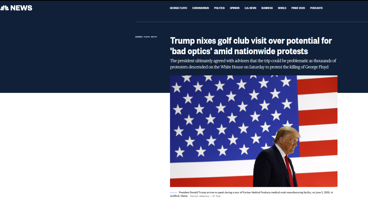 NBC援引两名知悉白宫决定的知情人士的话称,特朗普原计划在贝德明斯特高尔夫俱乐部度过周末,但白宫几天前改变了行程,使得贝德明斯特之行被取消。知情人士提到,目前全国性抗议仍在继续,行程的变更一定程度上是因为总统这时候前往他的私人俱乐部可能“公众影响会不好”(the potential for “badoptics” )。