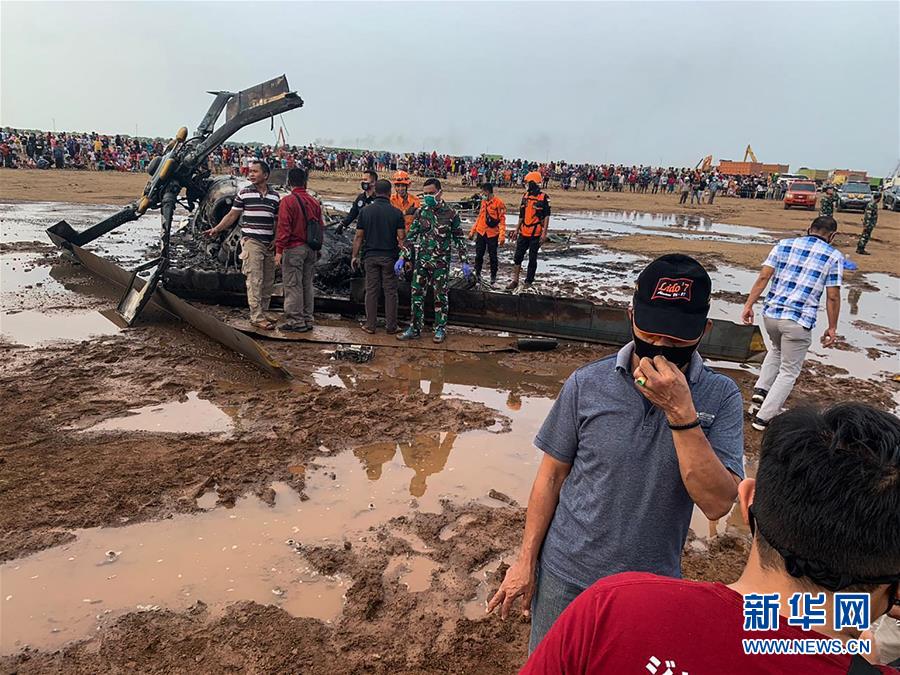 6月6日,在印度尼西亚中爪哇省肯德尔,救援人员查看直升机残骸。 印度尼西亚一架军用直升机6日在中爪哇省坠毁,造成4名军方人员死亡,另有5人受伤。 新华社发(中爪哇警察局供图)