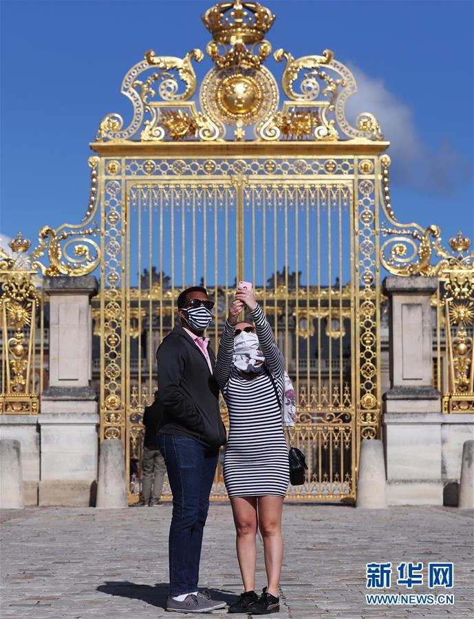 6月6日,游客在法国巴黎近郊的凡尔赛宫前自拍。 受新冠疫情影响关闭了82天的法国著名景点凡尔赛宫于6日重新开门迎客。始建于17世纪初的凡尔赛宫位于巴黎西南郊,曾是法国皇家宫殿,1979年被联合国教科文组织列为世界文化遗产。 新华社记者 高静 摄