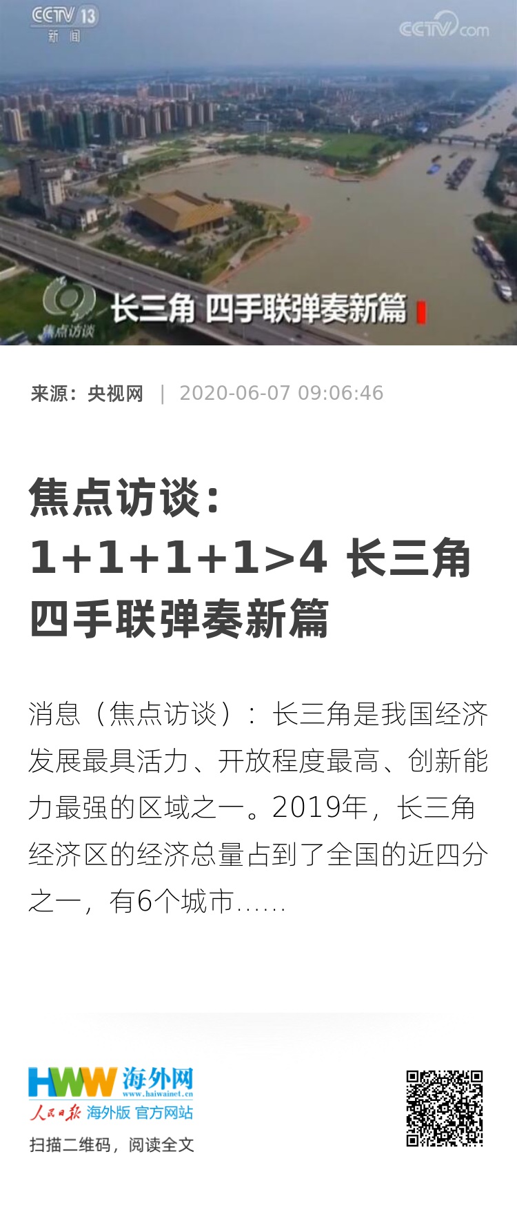 央视网消息(焦点访谈):长三角是我国经济发展最具活力、开放程度最高、创新能力最强的区域之一。2019年,长三角经济区的经济总量占到了全国的近四分之一,有6个城市经济总量突破1万亿元,包括我国经济总量排名最高的城市上海。长三角的各个城市怎样拧成一股绳,朝着世界级城市群的方向来发展呢?2019年5月,中共中央政治局会议审议了《长江三角洲区域一体化发展规划纲要》。那么,规划纲要实施一年来,上海、江苏、浙江、安徽如何加强互动合作?长三角一体化发展取得了哪一些进展?