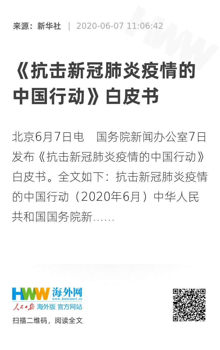 新华社北京6月7日电 国务院新闻办公室7日发布《抗击新冠肺炎疫情的中国行动》白皮书。全文如下: