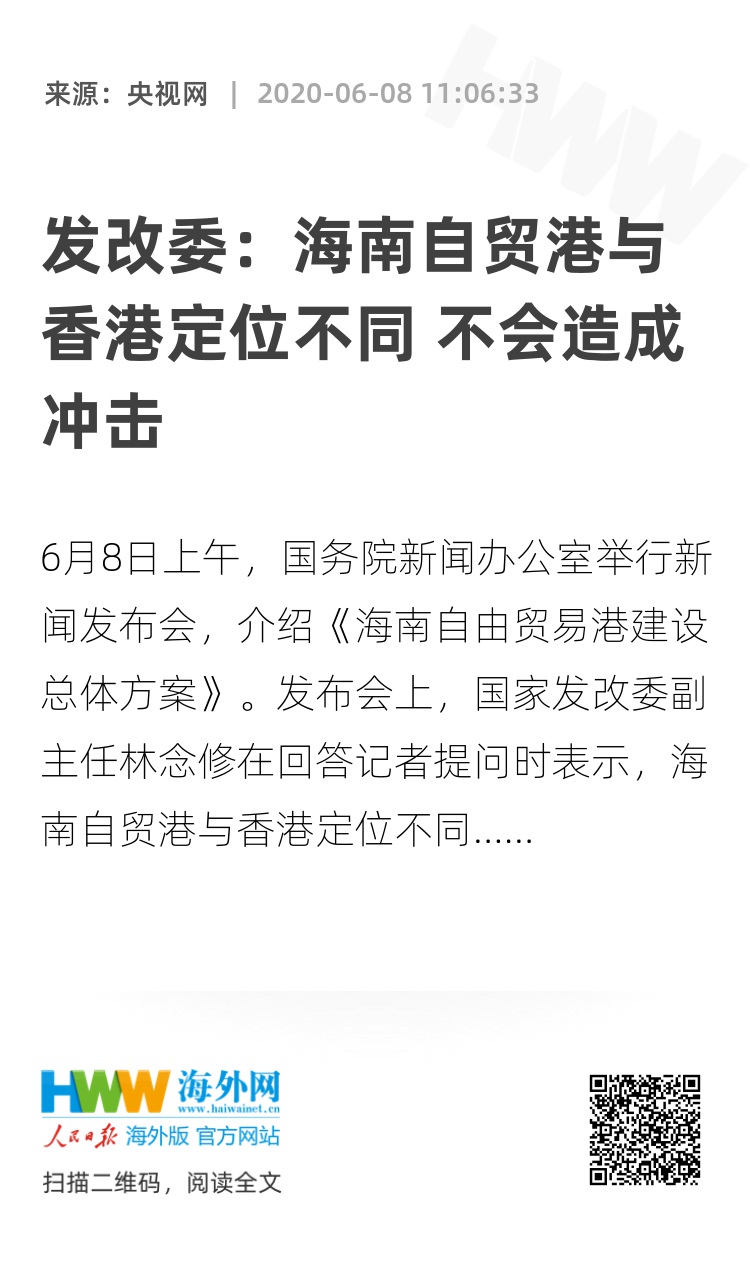 国家发改委副主任 林念修:在海南建设自由贸易港,我们既要学习借鉴国际上知名自由贸易港的先进经验,对接国际高标准的经贸规则,探索形成具有国际竞争力的开放制度体系,同时我们更充分发挥海南自然资源丰富、地理位置独特以及背靠超大规模国内市场和腹地经济的优势,重点突出贸易和投资自由便利,聚焦发展旅游业、现代服务业和高新技术产业,加快培育具有海南特色的合作竞争性优势,为全球自由贸易港发展注入新的活力。所以我想从这个意义来讲,海南自由贸易港与香港的定位不同,重点发展的产业也不同,应该说互补大于竞争,不会对香港造成冲击。